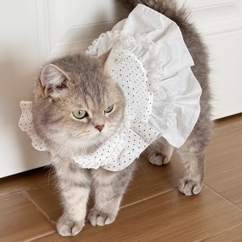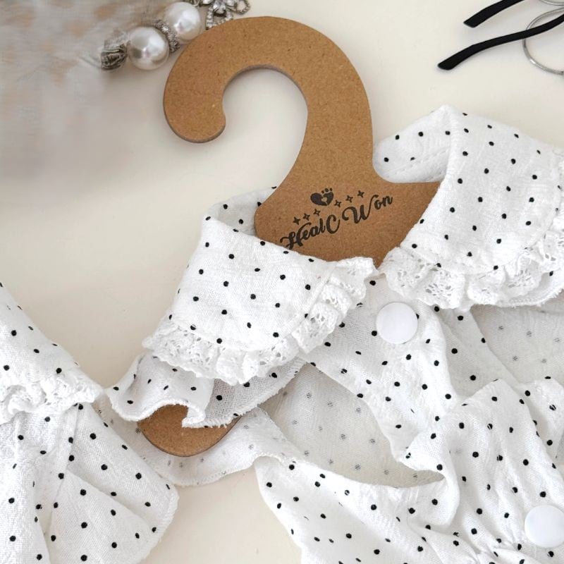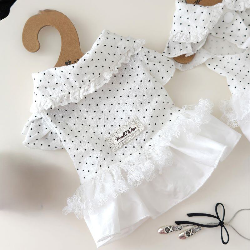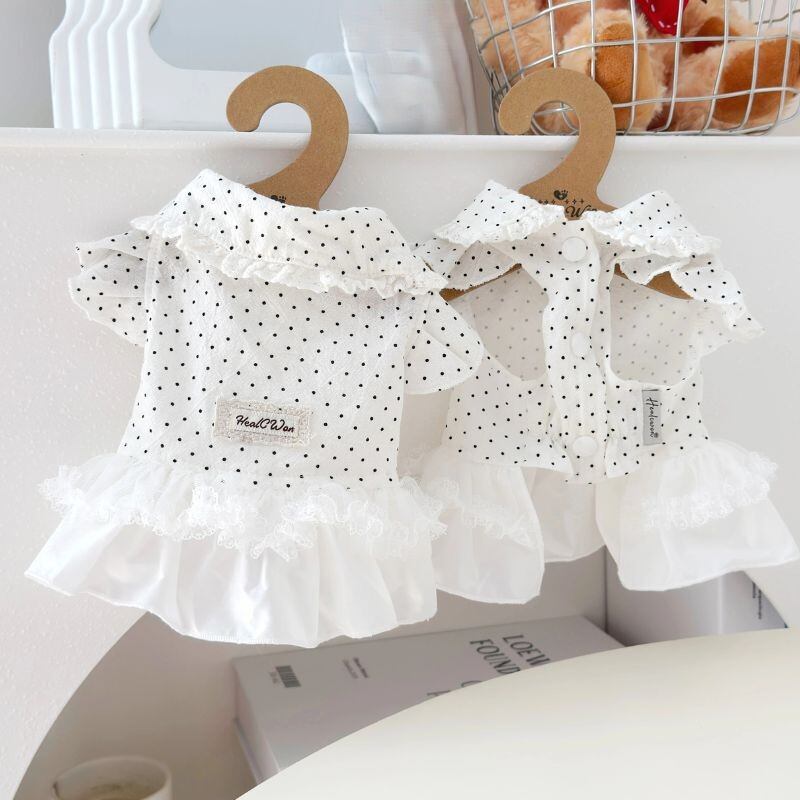ドット柄に刺繍レースが縁どられたラウンドカラーが映えるワンピース。