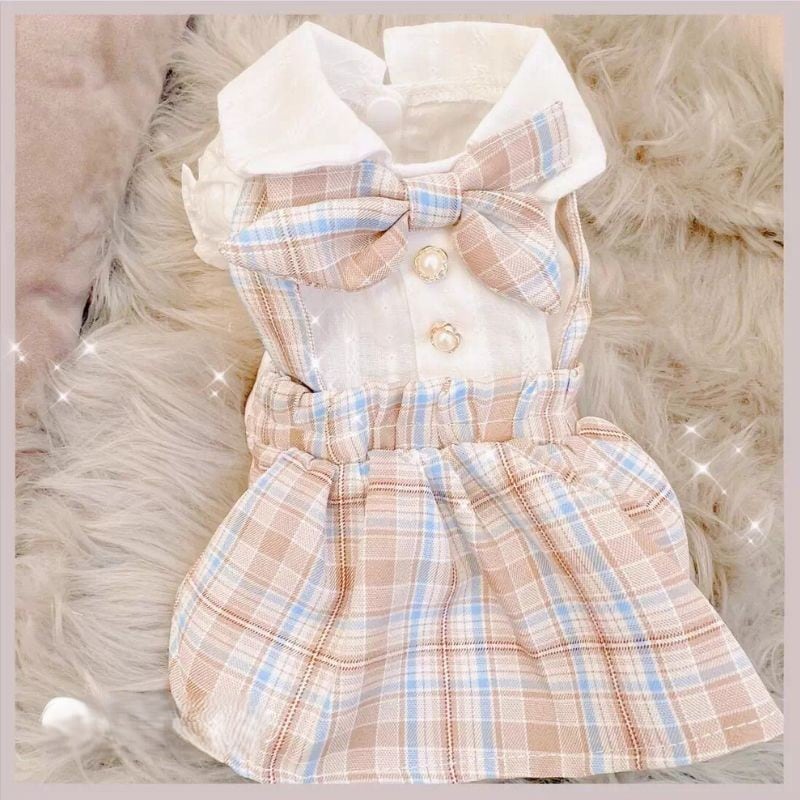 エアリーブルー&ベージュのチェック柄ワンピース 犬服 00759
