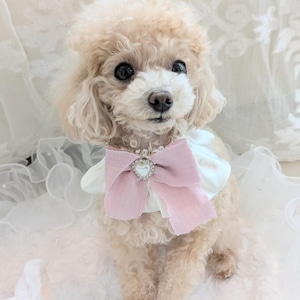 サテンの二重フリルが優雅に揺れ、ハート型ビジュー付きリボンがロマンティックなアクセント。