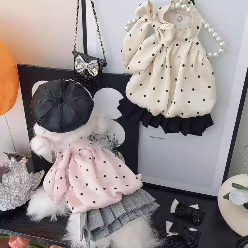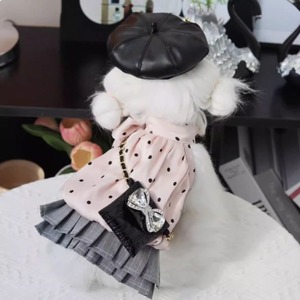 ドット柄トップスとプリーツスカートのドッキングワンピース 犬服 00863