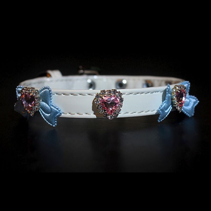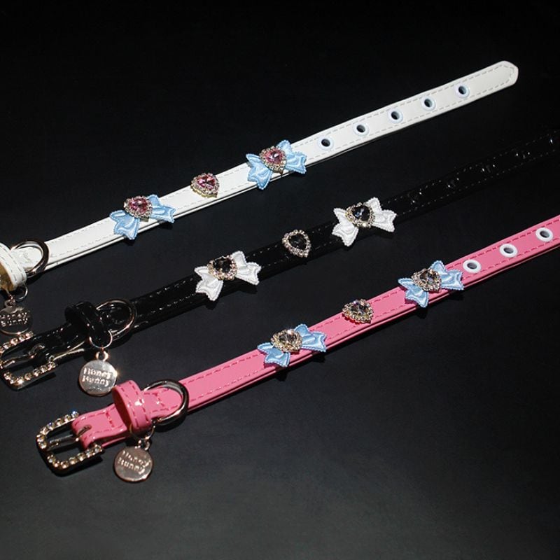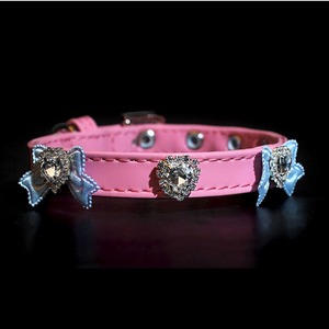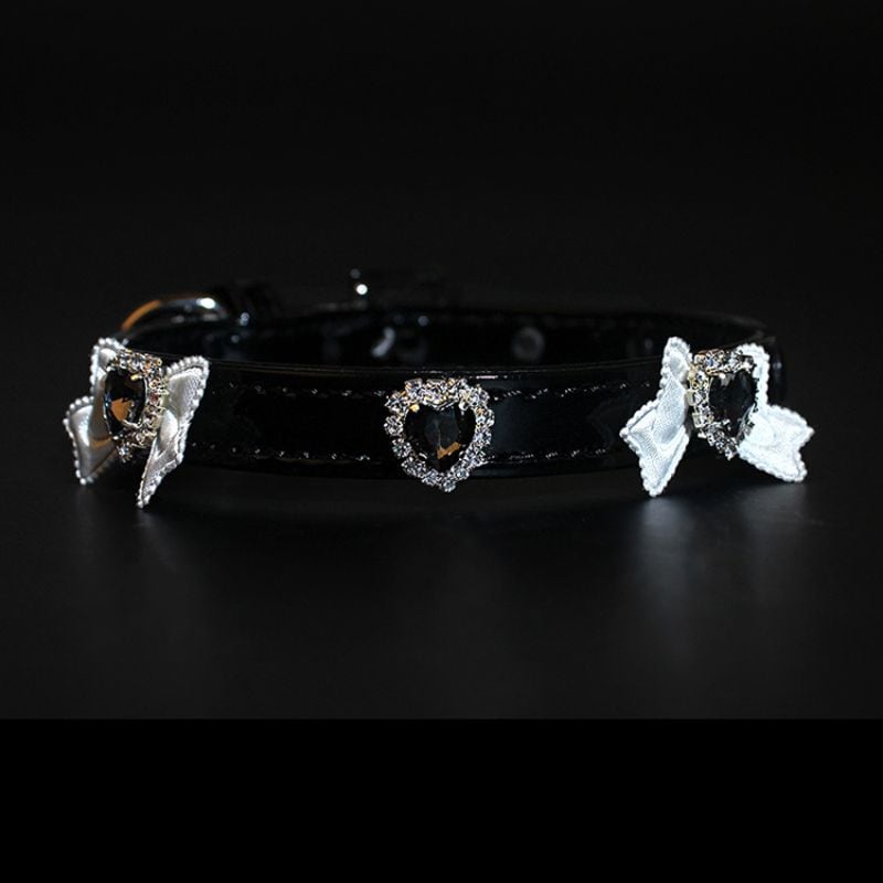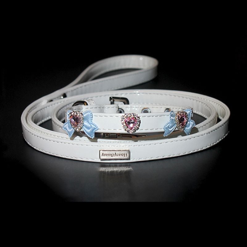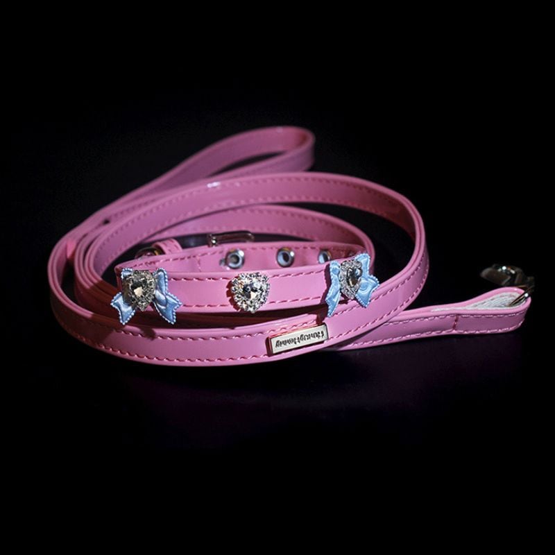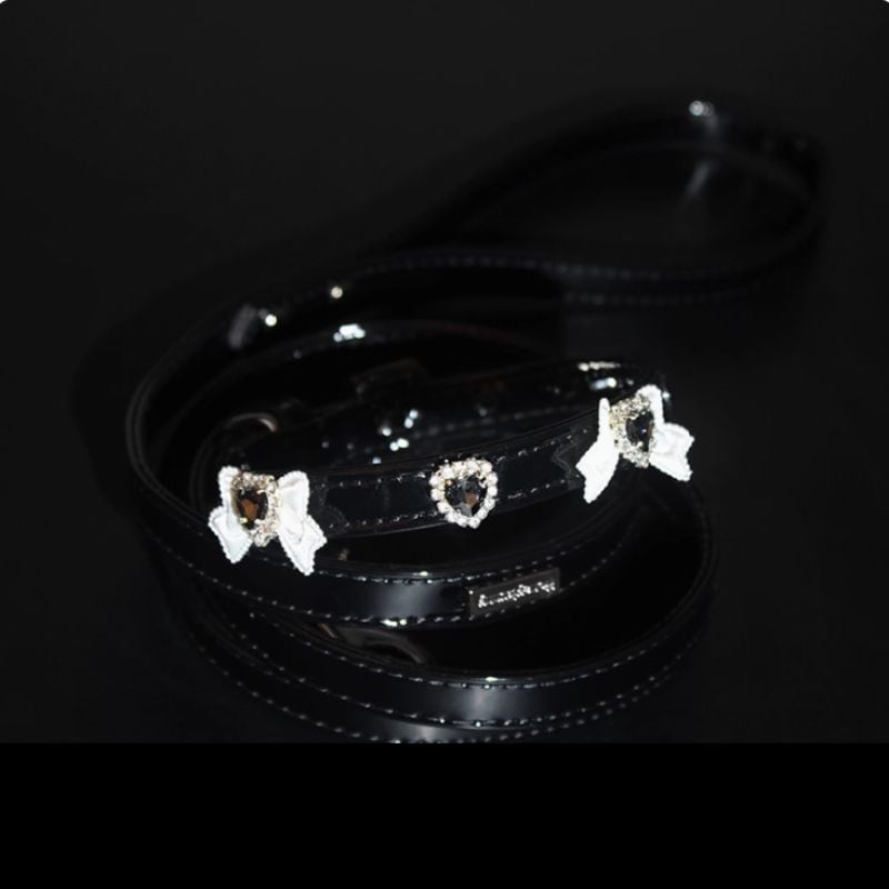 艶やかなエナメルレザー調にハートビジューがきらめく首輪とリードのセット。