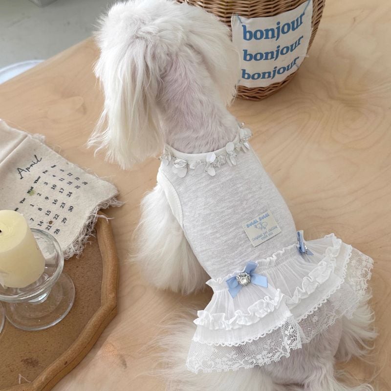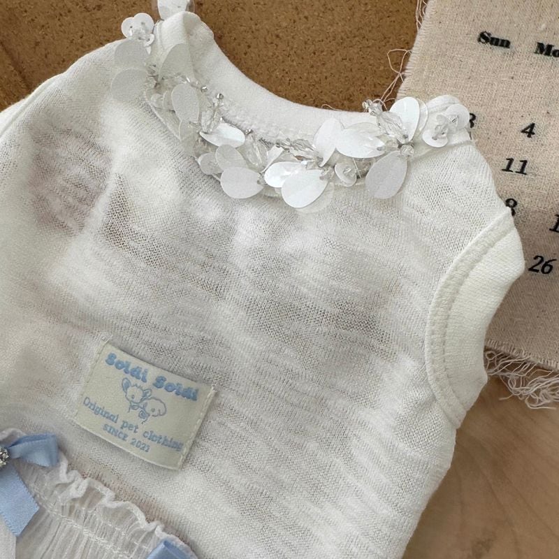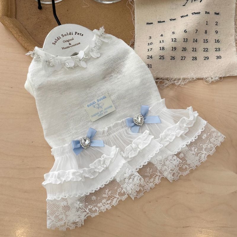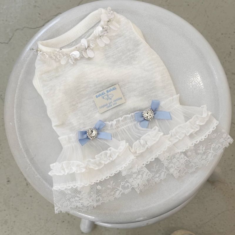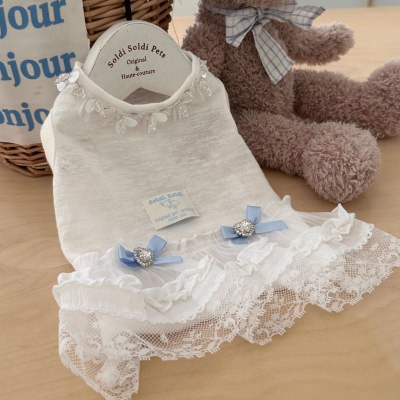 ウエストにはハート型ビジュー付きの水色のリボンが愛らしさを引き立てます。