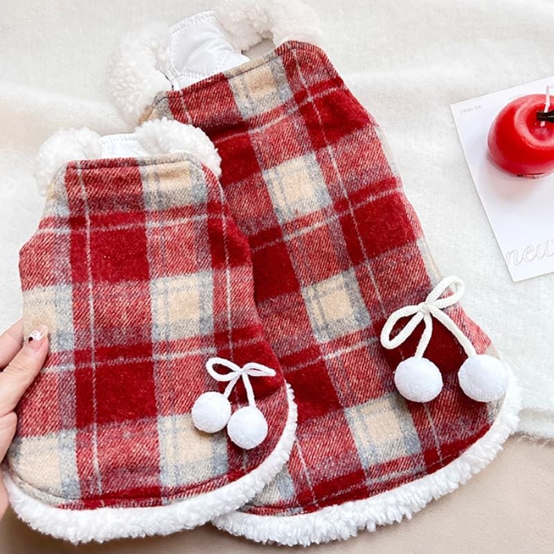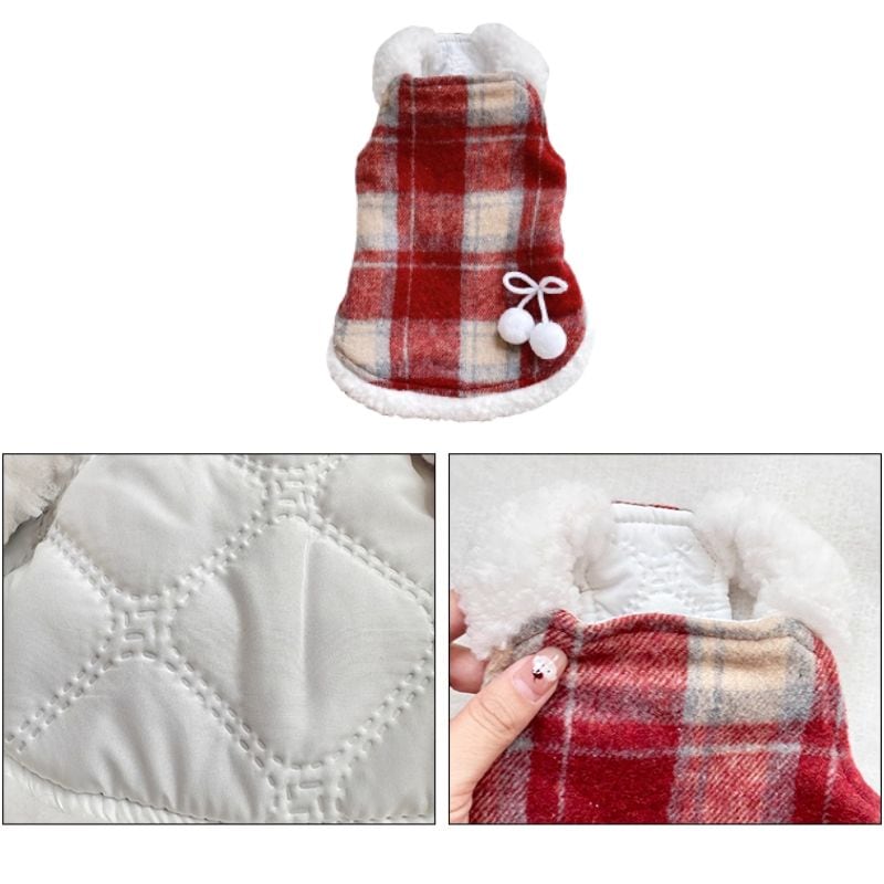タータンチェックのウールに中綿を仕立てたサロペット風ワンピース。