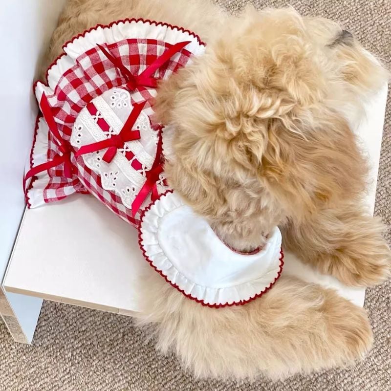 襟と裾の赤いスカラップ刺繍がチャーミングで、背中のアイレットレースとリボンがクラシカルな魅力。