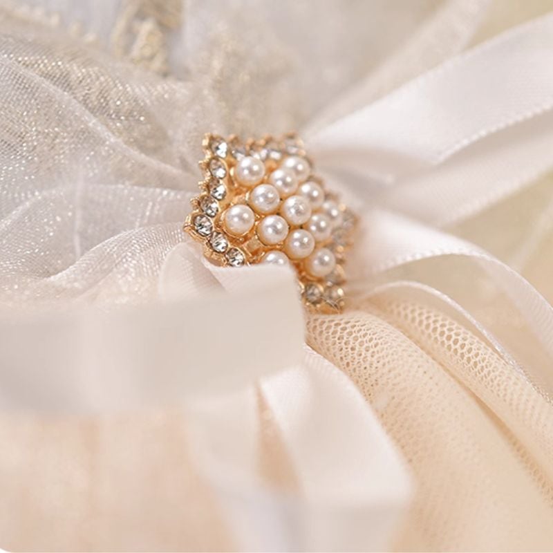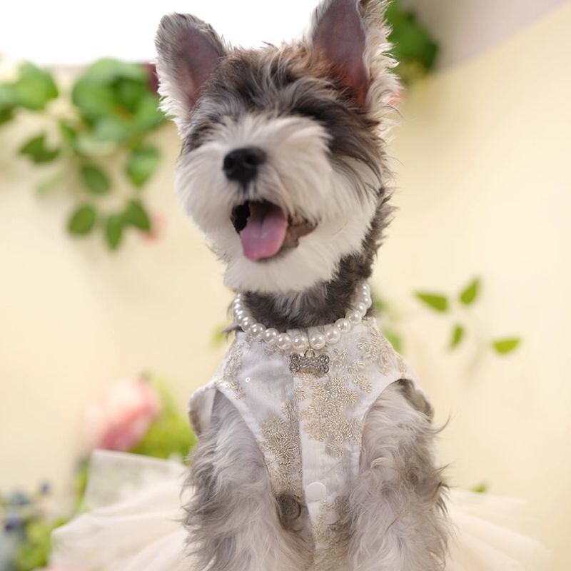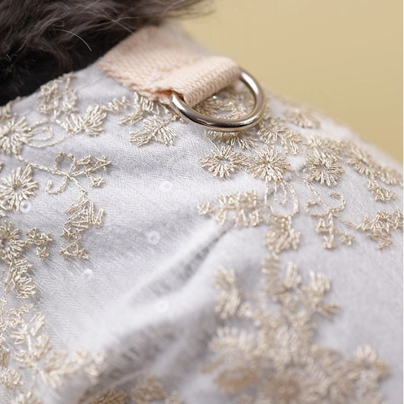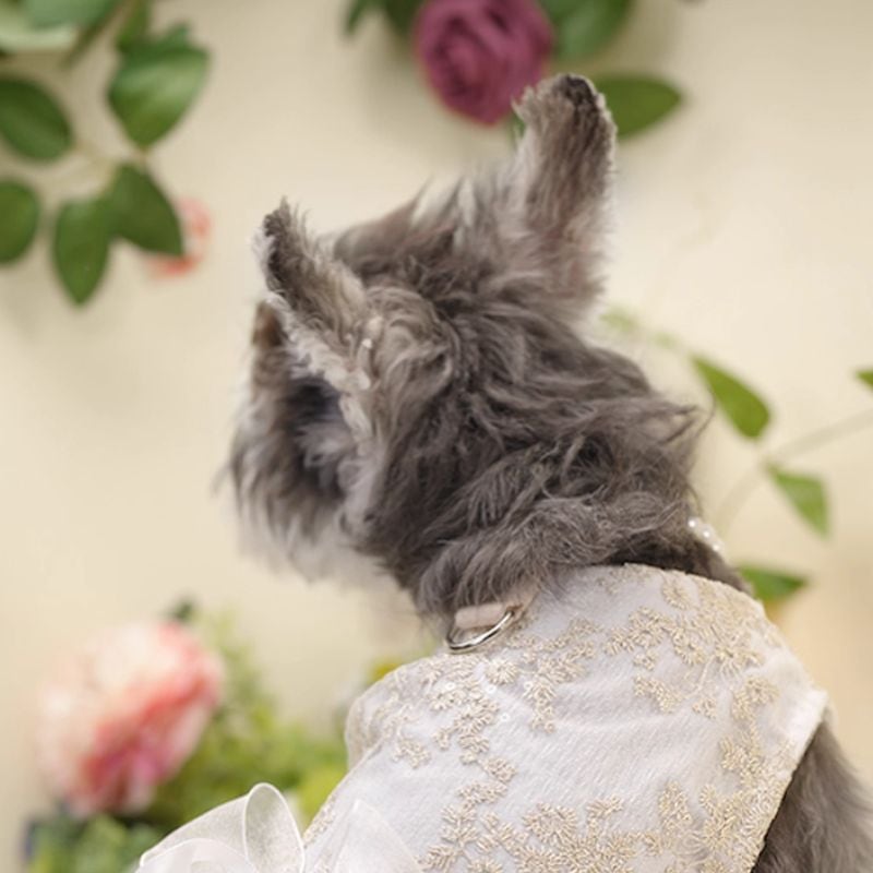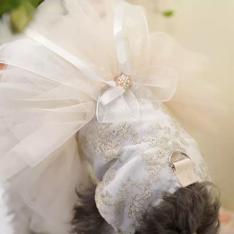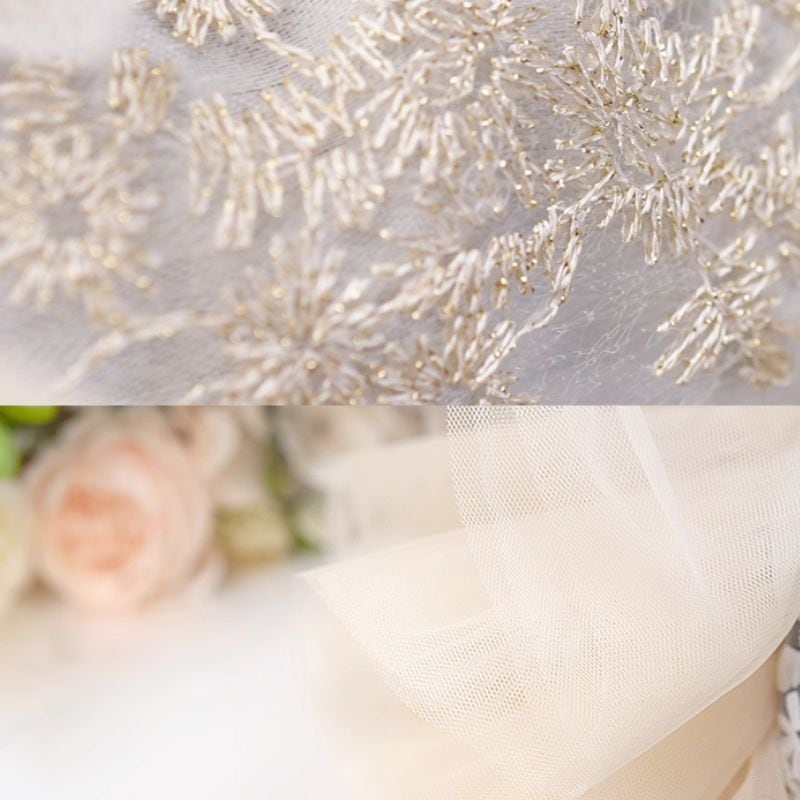 豪華な金糸刺繍のトップスに、軽やかに広がるティアードチュールスカートを合わせた特別感あふれるドレス。