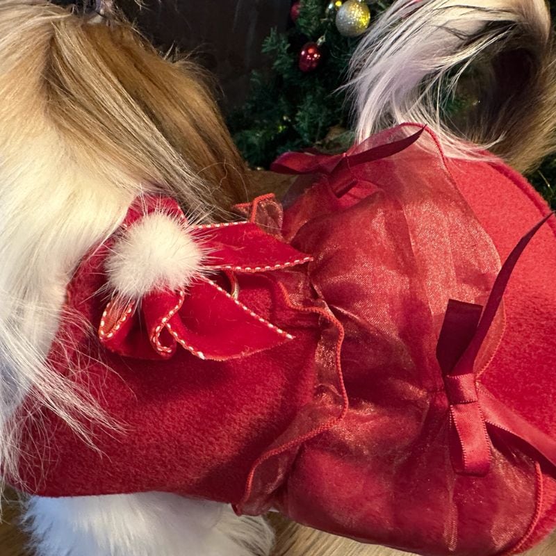 真っ赤なベルベットが優雅に映えるボートネックのドレス。