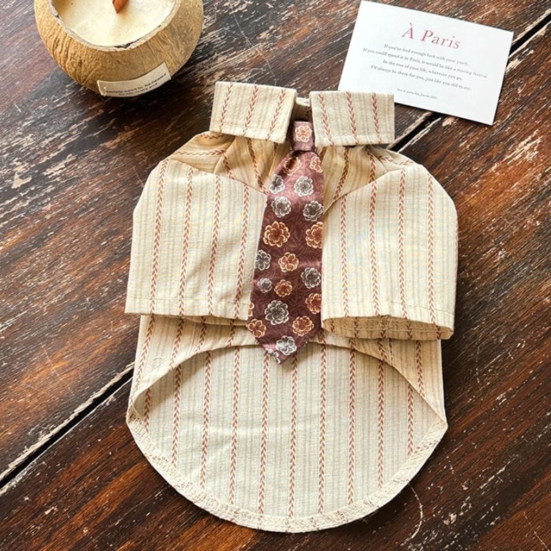 レギュラーカラーがきちんと感を添え、花柄ネクタイが遊び心をプラス。