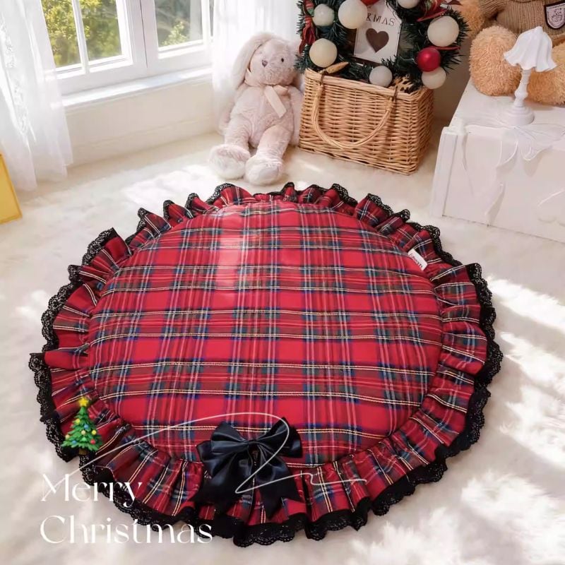 赤いタータンチェックがクラシカルに映えるサークルマット。