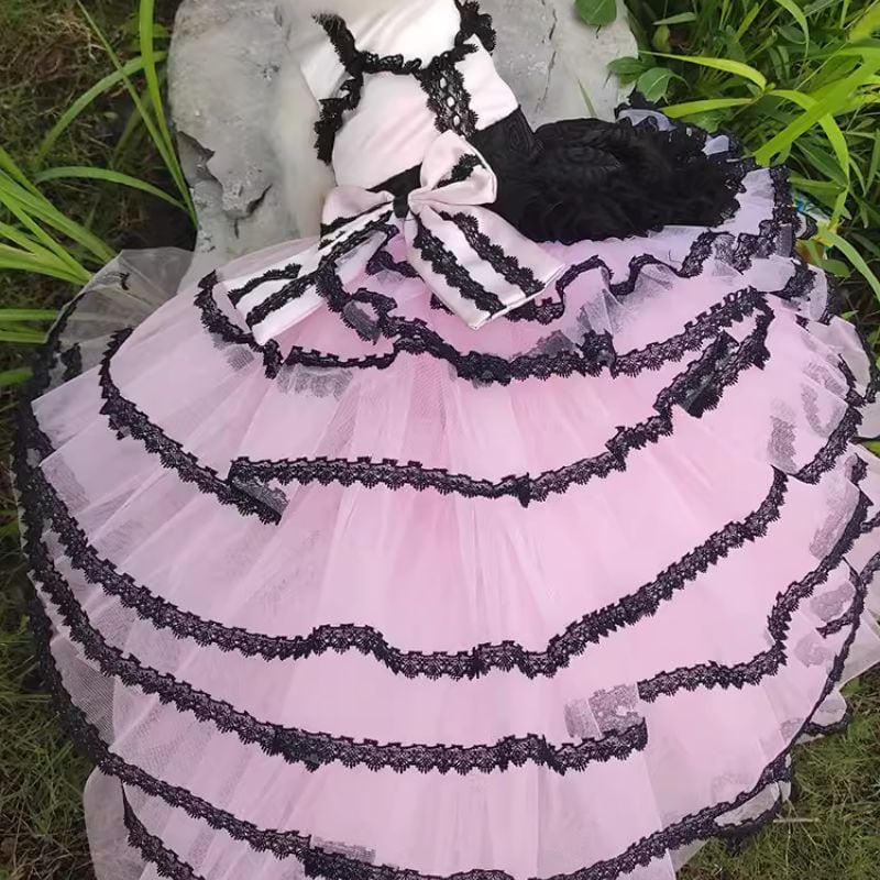 リボンとレースをふんだんに散りばめたピンクロリータ風2wayドレス。