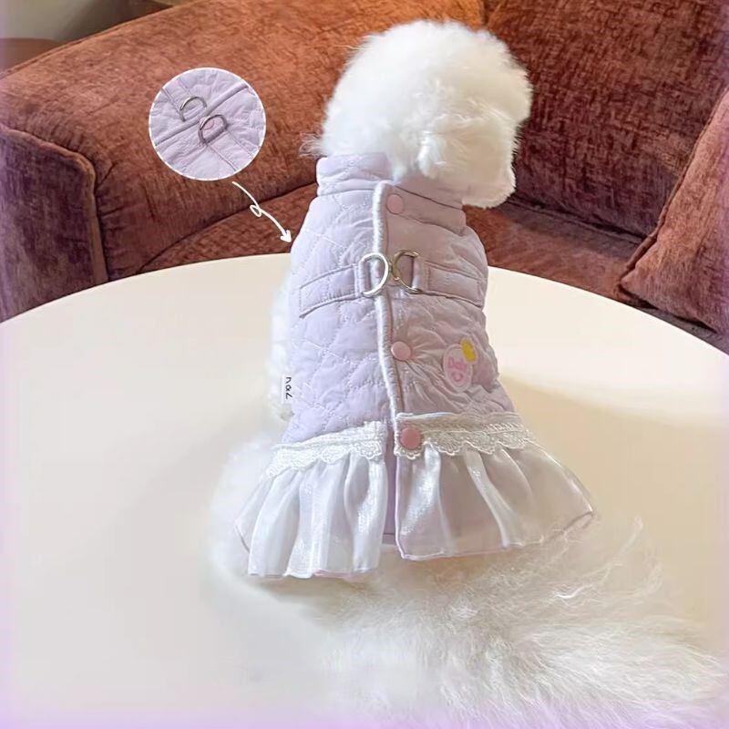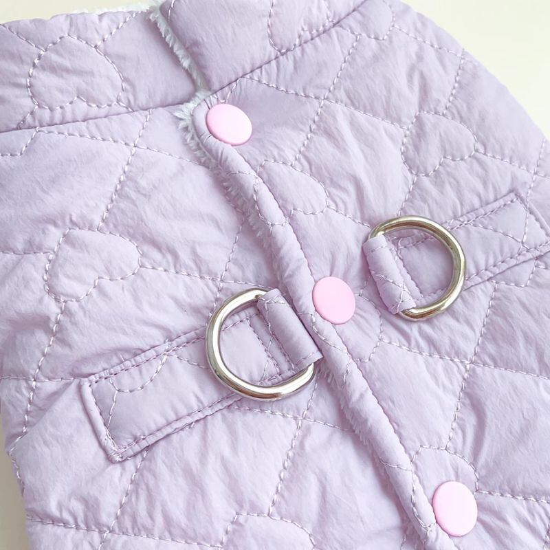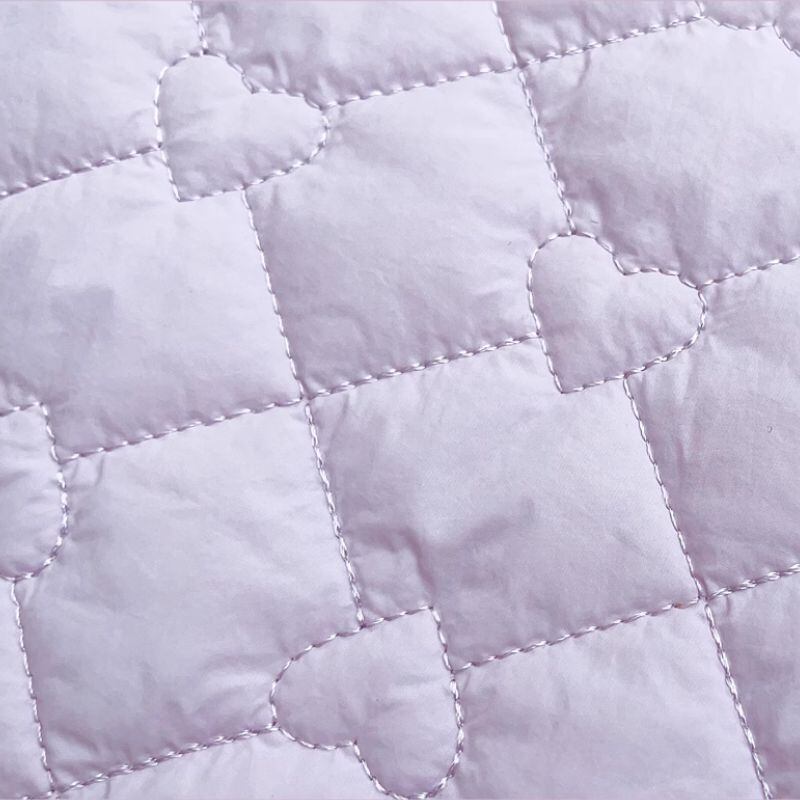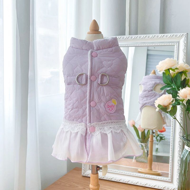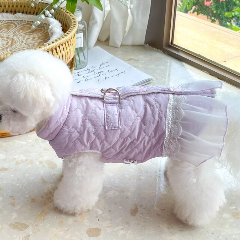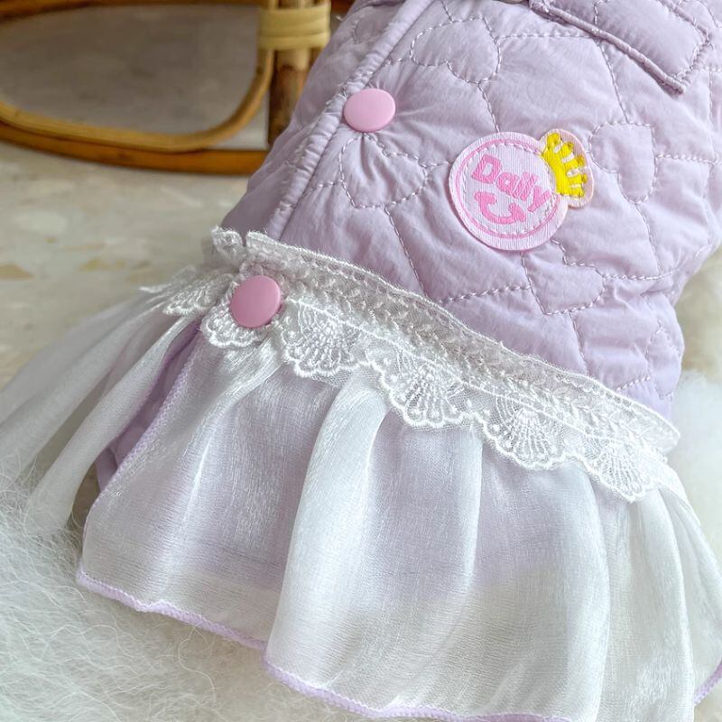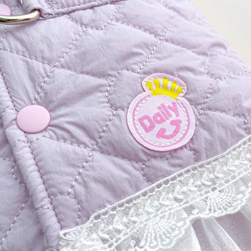 淡いパープルのキルティングベストは、裾に白レースがあしらわれて、