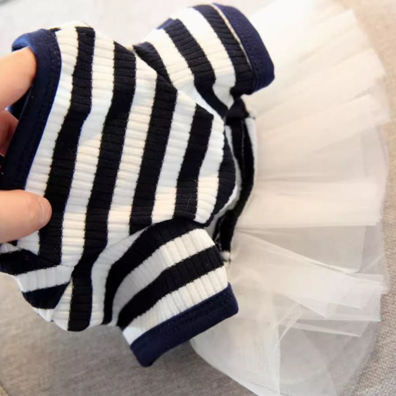 ボーダー柄のトップスに、二重オーガンジーのギャザースカートが可愛い一着です。