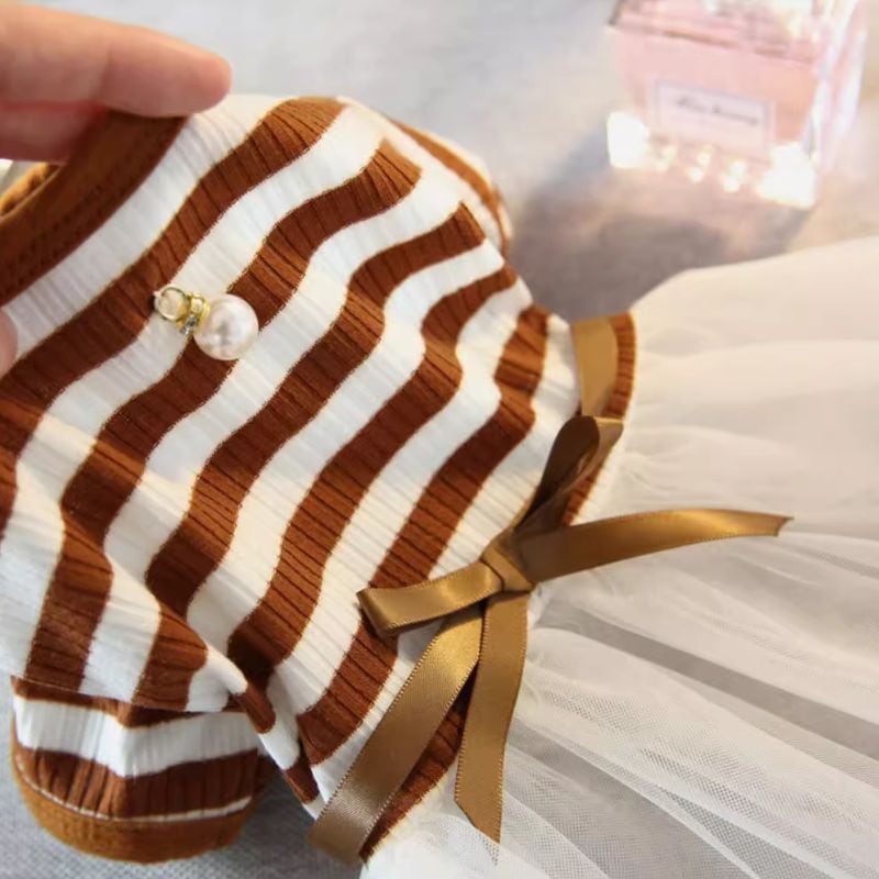 切り替え部分のリボンと、背中のパールビーズがアクセントになり、上品さが光ります。