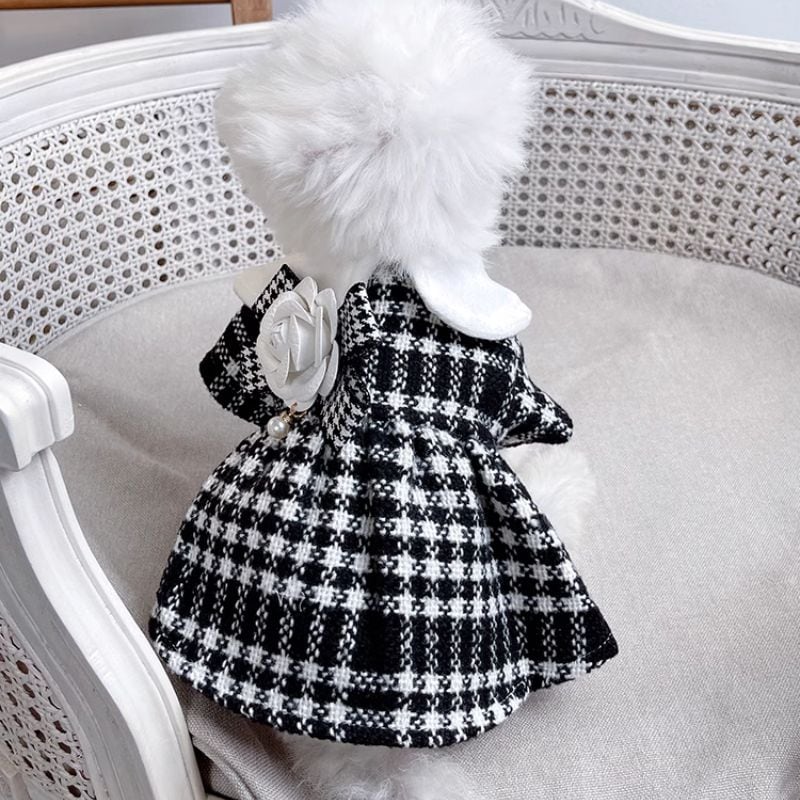 白黒千鳥のレトロなドレスは、白い丸襟と千鳥格子リボンに