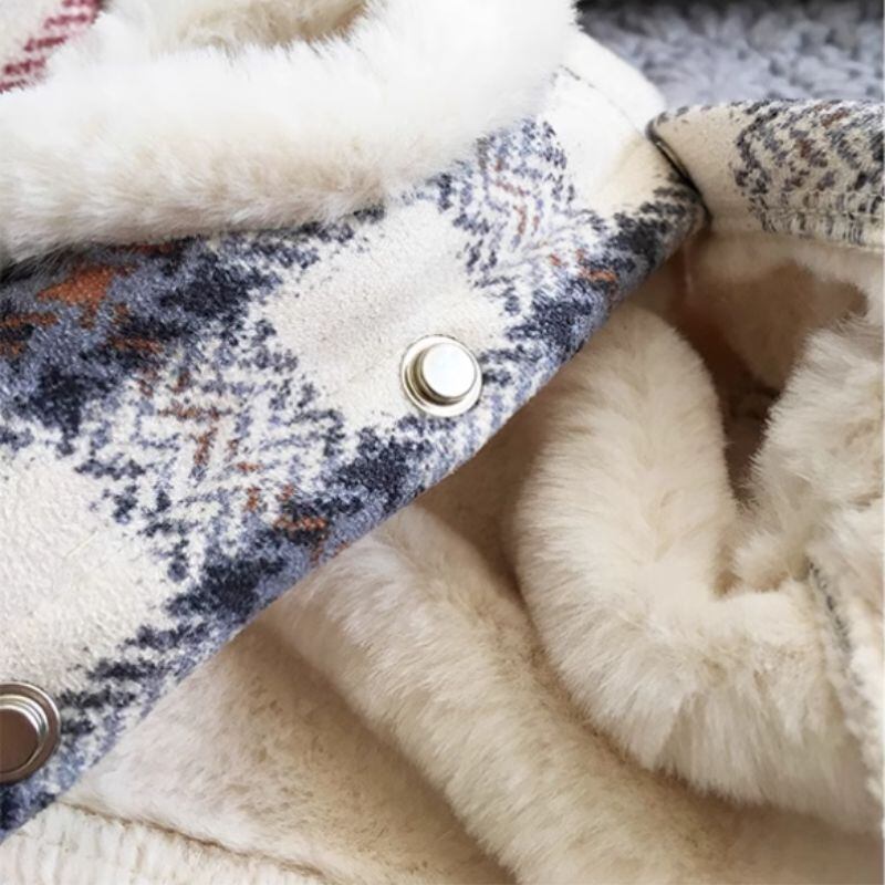 チェック柄のベストは、襟と袖口、裾に白いボアをあしらい、