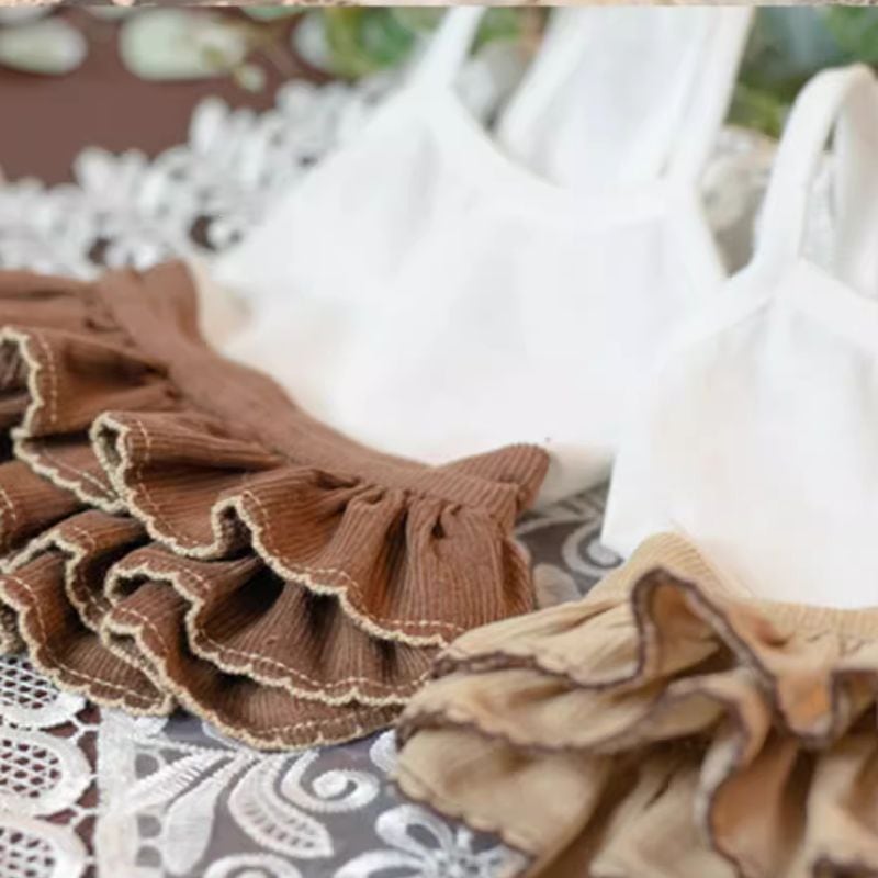 トップスは白いキャミソールで、アンダー部分は茶系のティアードスカートのワンピース。
