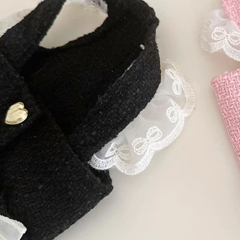 ツィード素材のワンピース。ストラップと裾にレース刺繡が施され、上品さを演出しています。