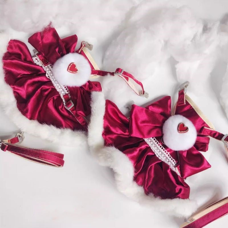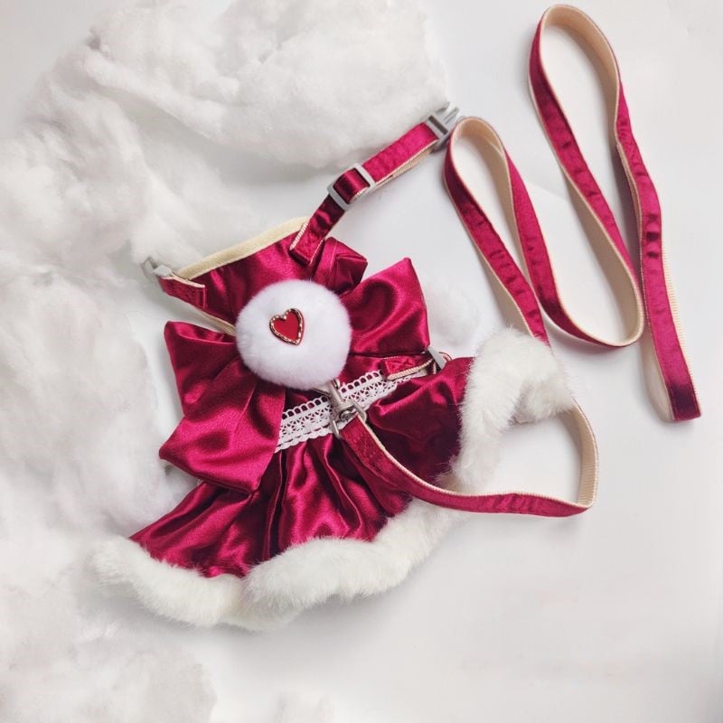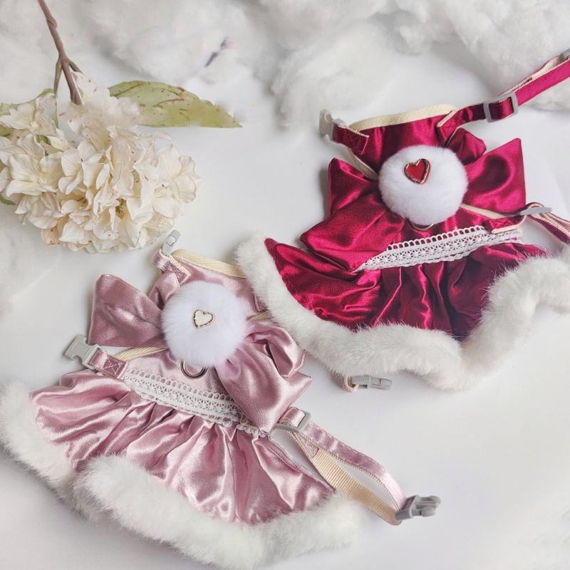 サテンとフェイクファーのワンピース風ハーネス(リード付) 犬服 00522