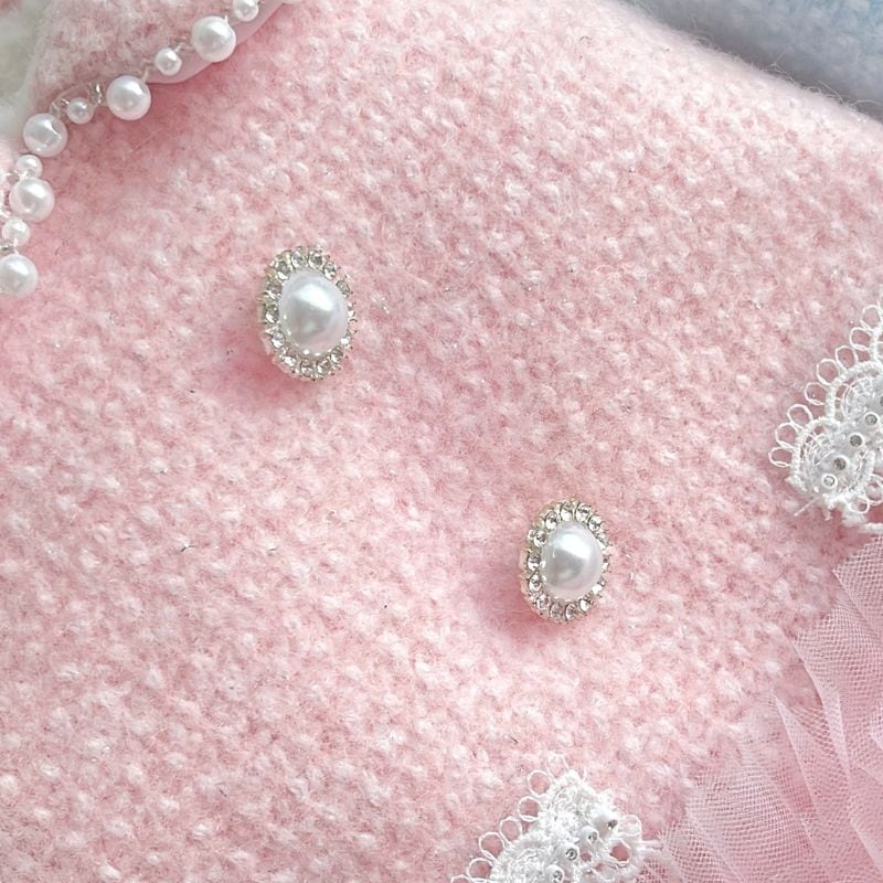 パステルカラーのツィードニットワンピースは、ラウンドカラーにパール風ビーズが縁どられています。
