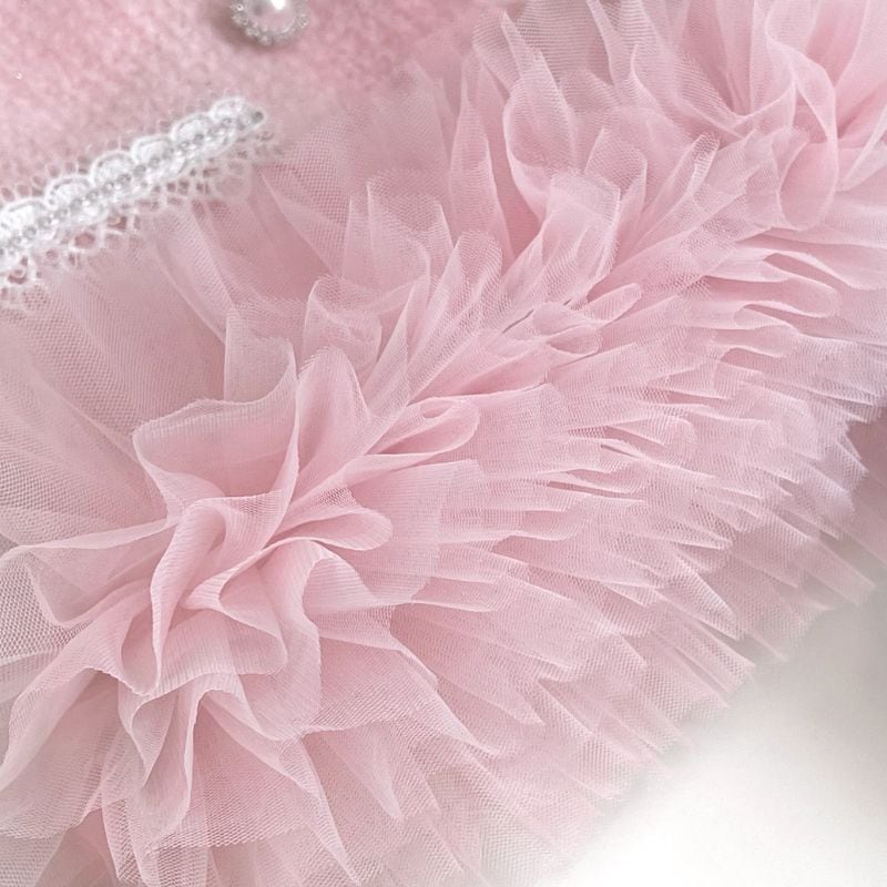 背中にはネットレースのフラップとパール風ビーズの飾りボタンが付き、スカートはオーガンジーのボリューミーチュチュで華やかさを演出しています。