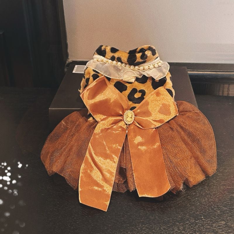 背中のアンバーブラウンサテンのロングテールリボンとカメオ調ブローチが気品を引き立てます。