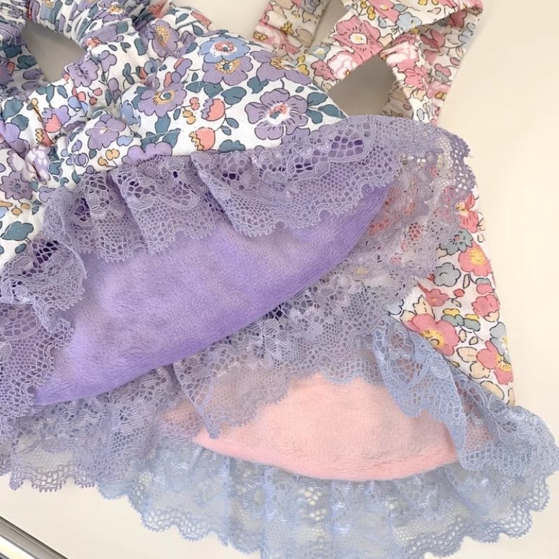 裾に刺繡レースがあしらわれ、上品さと愛らしさを兼ね備えた一着です。