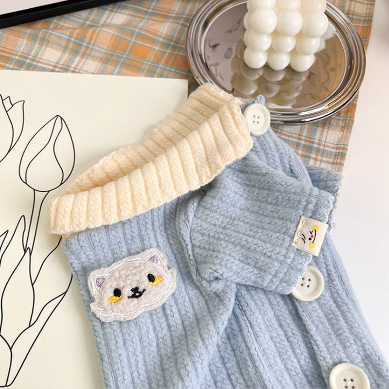 襟とボタンが同色で統一感があり、背中のワッペンと右袖のイラストタグがさりげない遊び心を添えています。