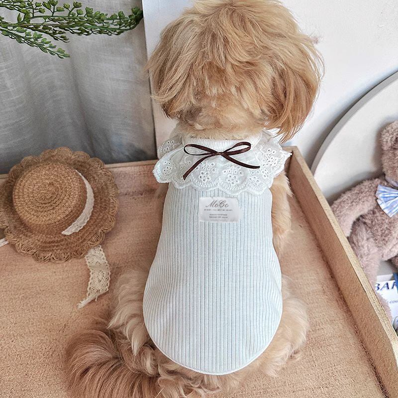 レース襟のコットンカットソー(ホワイト/ブルー) 犬服 00640